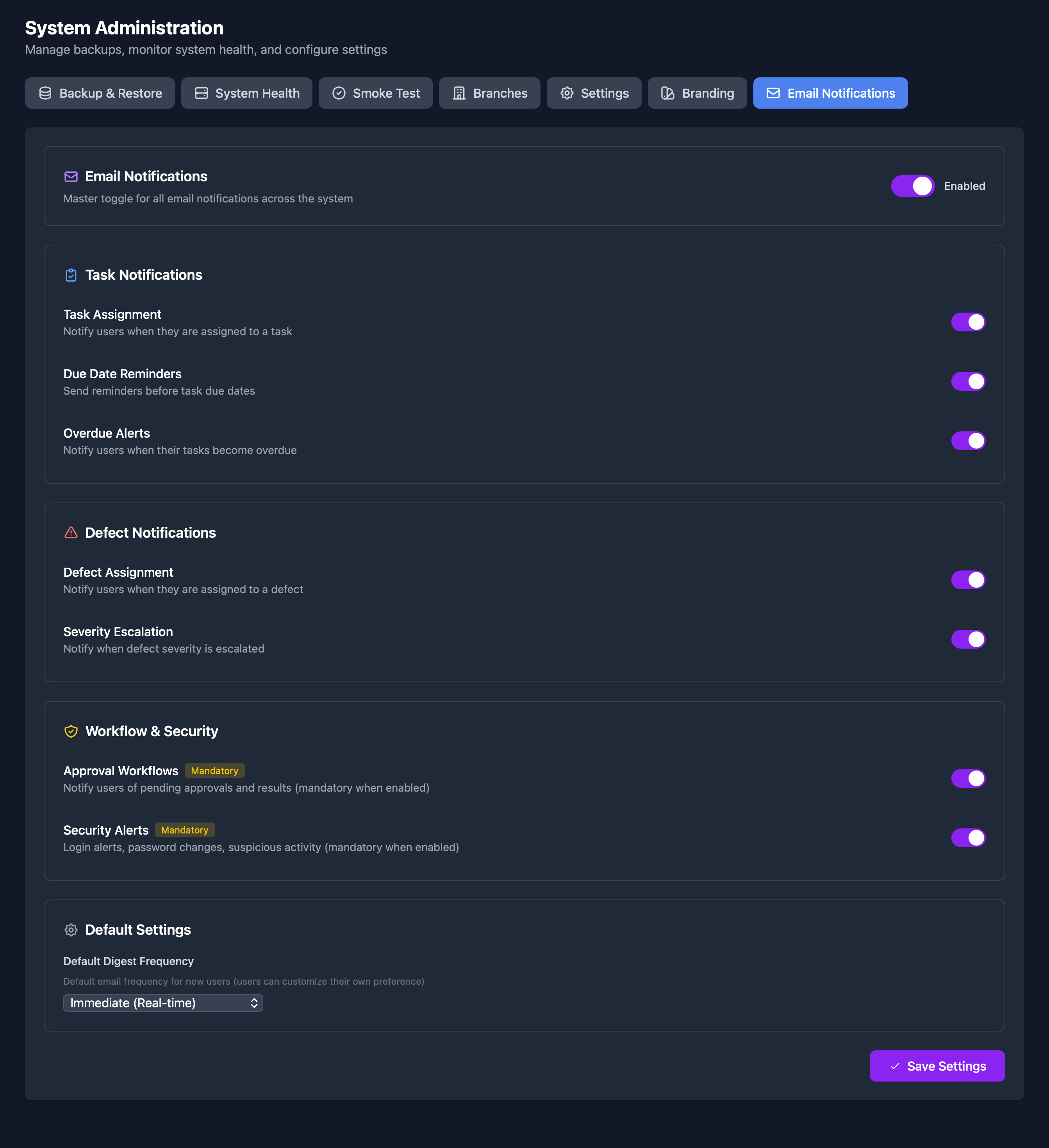 - Enable/disable email notifications globally